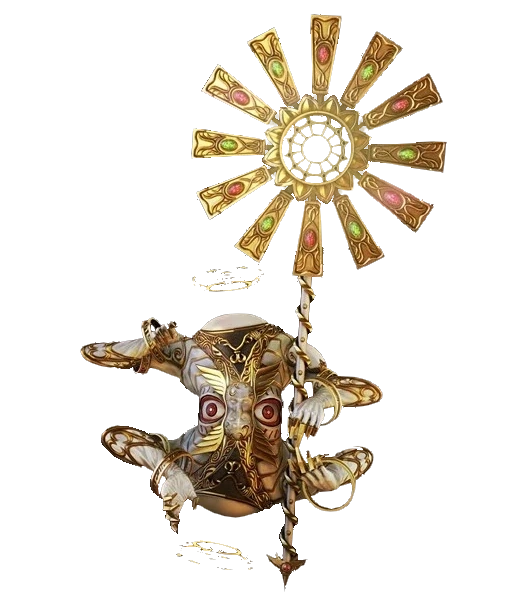 De nombreuses théories tentent d'expliquer pourquoi il est constitué de deux corps humains soudés au niveau du torse. Il est possible que son apparence soit destinée à dépasser l'entendement humain, mais il est également plausible que dans la profondeur de sa méditation, un moine ayant presque atteint la félicité l'ait brièvement aperçu réfracté entre plusieurs dimensions. »