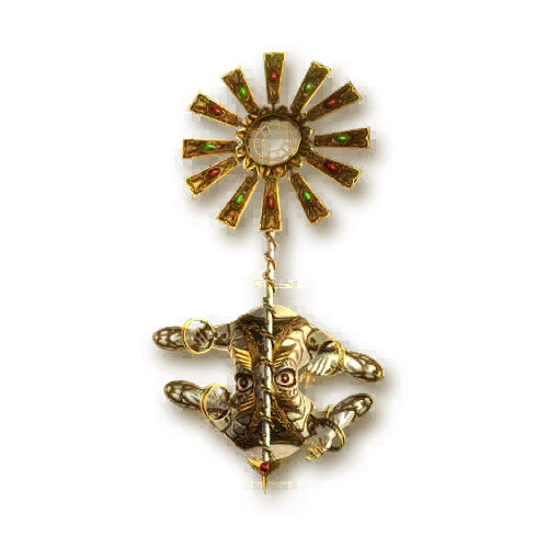 Enrapture is a small angel with a roundish body that has two red, piercing eyes in the middle and is decorated with gold lace, and ornaments. It has four limbs at the corners of its body, each ending in a claw that has golden bracelets around the wrists. Enrapture carries a large staff in the shape of a sun motif, complete with red and green jewel decorations. Enrapture also floats through the air to move around.