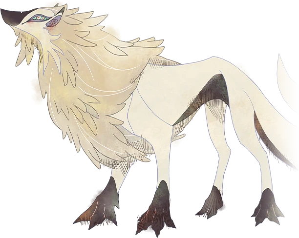 In his wolf form, Lukaon is a medium-sized white wolf with a shaggy mane, glowing blue eyes, and black paws.