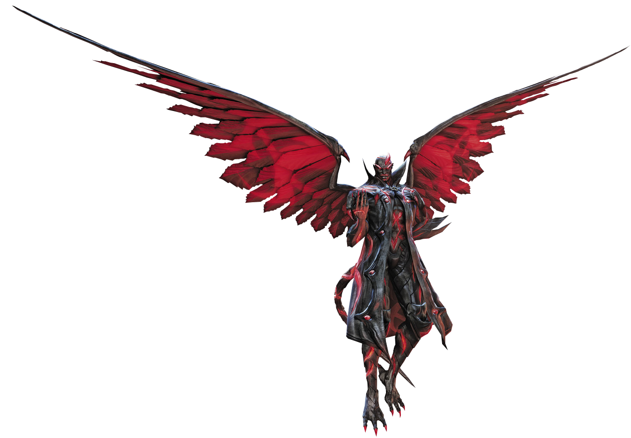 In his demonic form, Rodin gains pitch black and red skin, his hand and feet turning into sharp red claws with three claws on the front of each foot and an extra claw at the heel. His coat appears to become part of his body, with only the collar closed and lifted and his facial features are accentuated by red markings and crystalline growth on his brow and a single horn on his head, mimicking the nature of other Infernal Demons. He also gains a set of red feathered wings that reference him being a fallen angel, along with a sharp tail.
